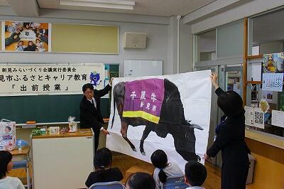 新見みらいづくり会議実行委員会から3名の講師をお迎えし、新見市が誇る特産品であるピオーネ、桃、千屋牛、石灰について詳しくお話を聞かせていただきました。子ども達にとって、「初めて知った!」という驚きの連続で、「ふるさと新見」の良さ・すごさを改めて実感することができた貴重な授業となりました。