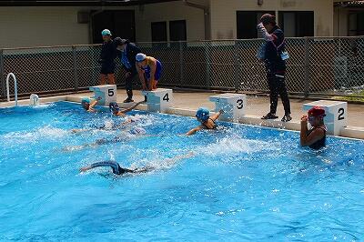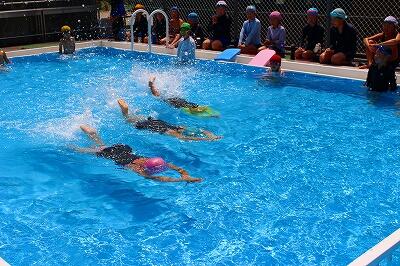 子どもたちは自分で決めた目標に向かって、プールでの学習を頑張ってきました。その成果を発表する会を行いました。低学年は、「潜る」「浮く」「泳ぐ」を発表しました。中・高学年は泳ぐ距離やタイムなどに挑戦しました。それぞれに自分の力を精一杯発揮していました。