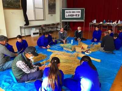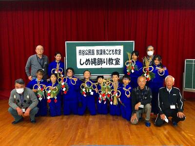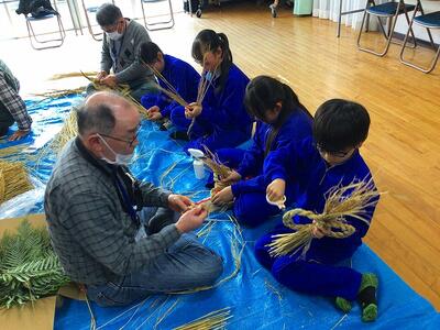 5.6年生が熊谷公民館で「しめ縄飾りつくり教室」に参加させていただきました。講師には、5名の地域の方がボランティアとしてお越しくださり、丁寧に作り方を教えてくださいました。最初は悪戦苦闘していた子ども達でしたが、次第にコツをつかみ、「眼鏡型」と「リース型」の正月飾りを完成させることができました。